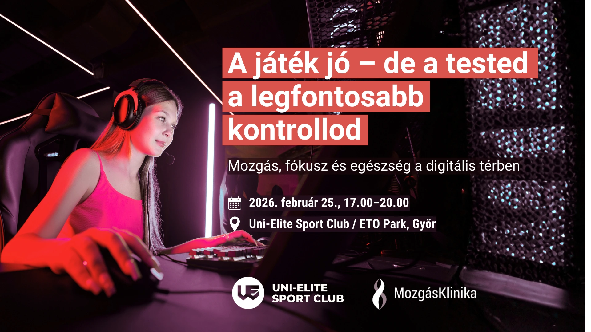 Csatlakozz a MozgásKlinika és a Széchenyi István Egyetem közös győri eseményéhez, ahol a gamer életmód mozgásszervi hatásait mutatjuk be szakmailag hiteles, mégis könnyed formában.​ Az esemény ingyenes, de regisztrációhoz kötött.